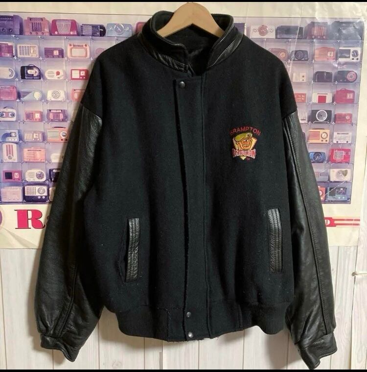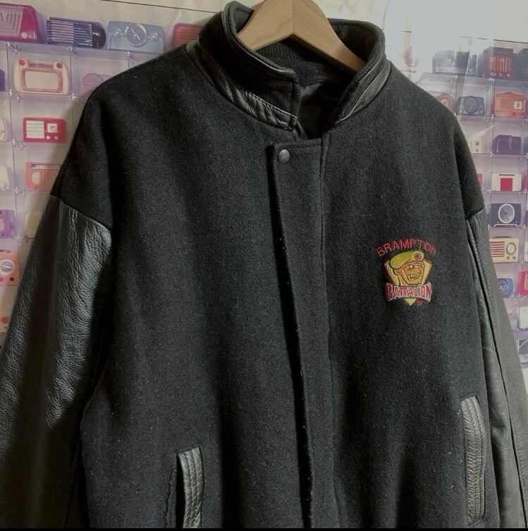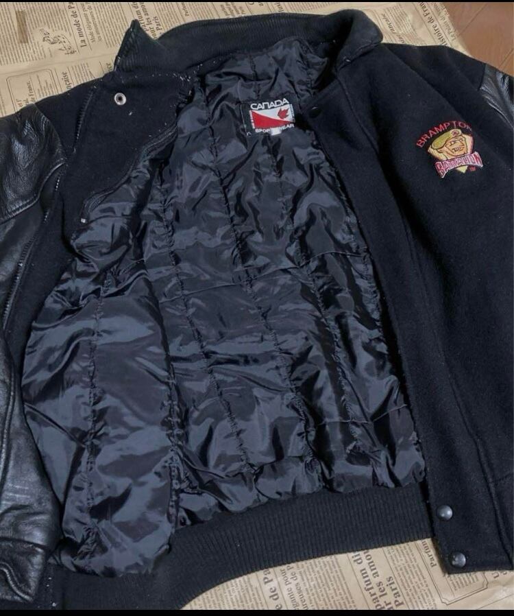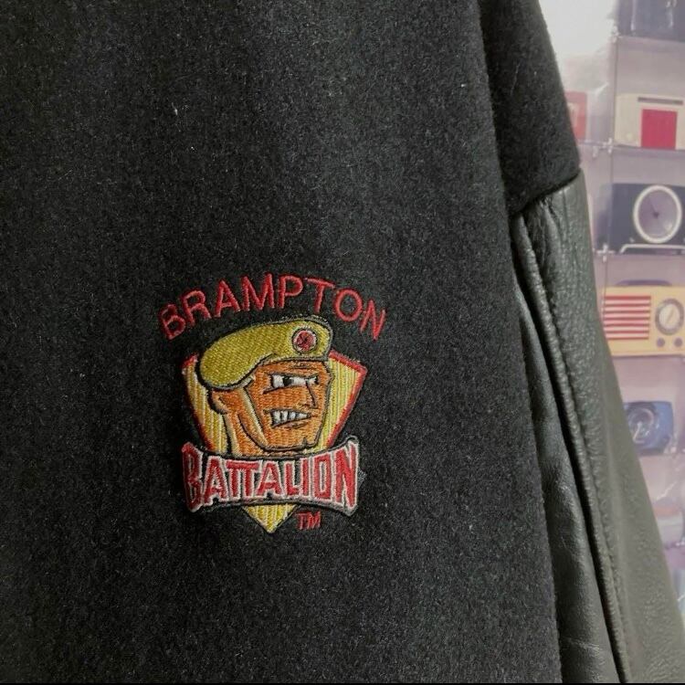 90s カナダ製CANADA SportsWear袖レザースタジャンバーシティジャケットカナダスポーツウエア アワードウェアOHL Brampton Battalionモデル