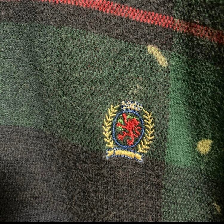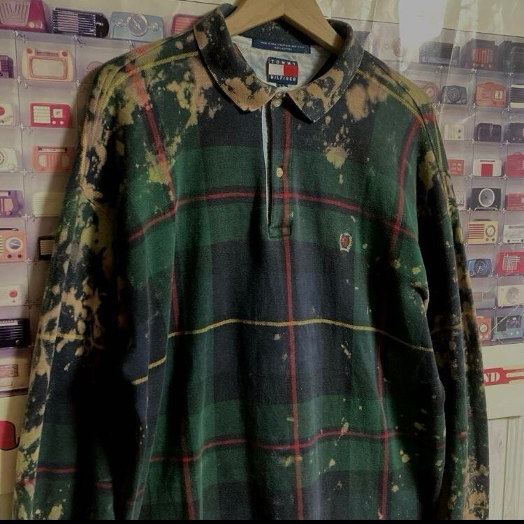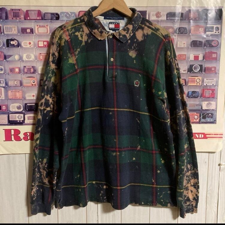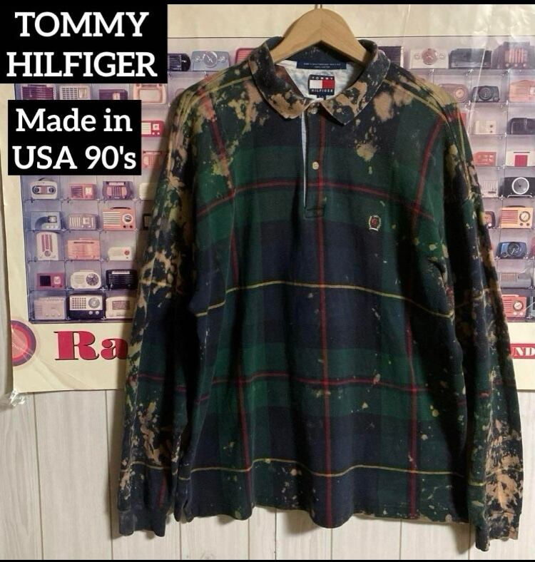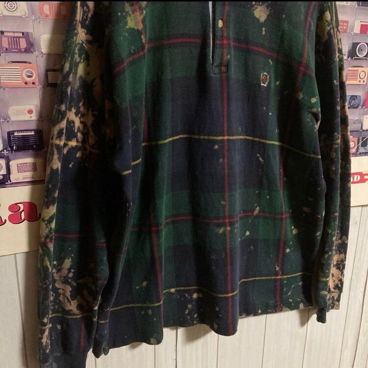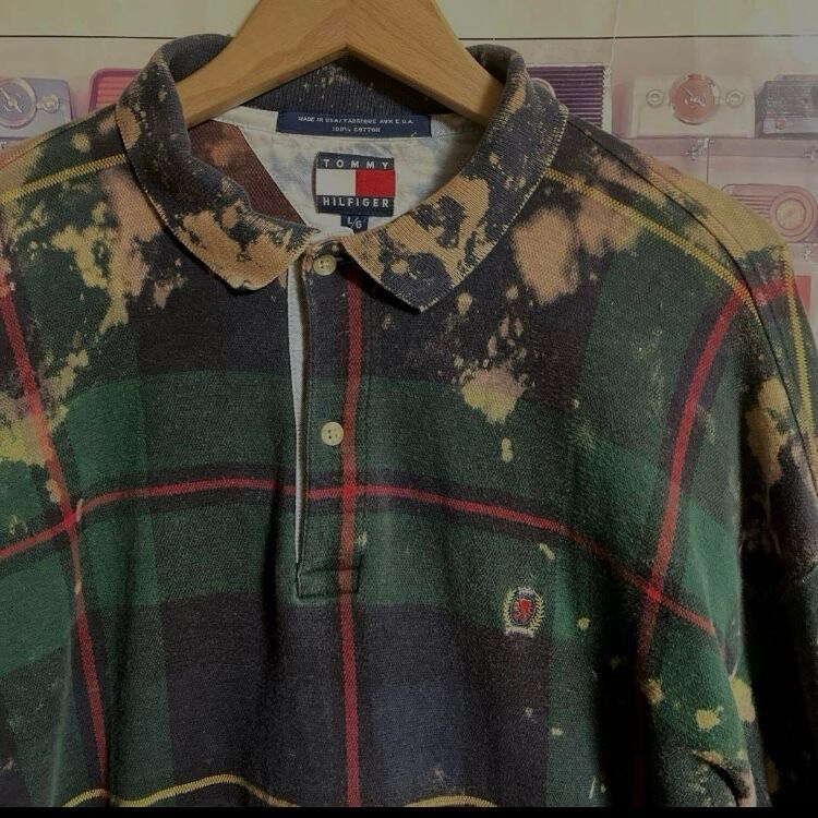USA製90sフラッグタグTOMMY HILFIGER ブリーチペンキ/チェック柄長袖ポロシャツOLDオールドトミーヴィンテージラガーシャツ