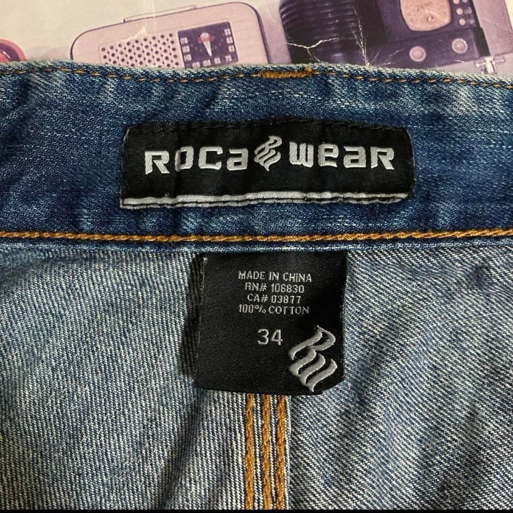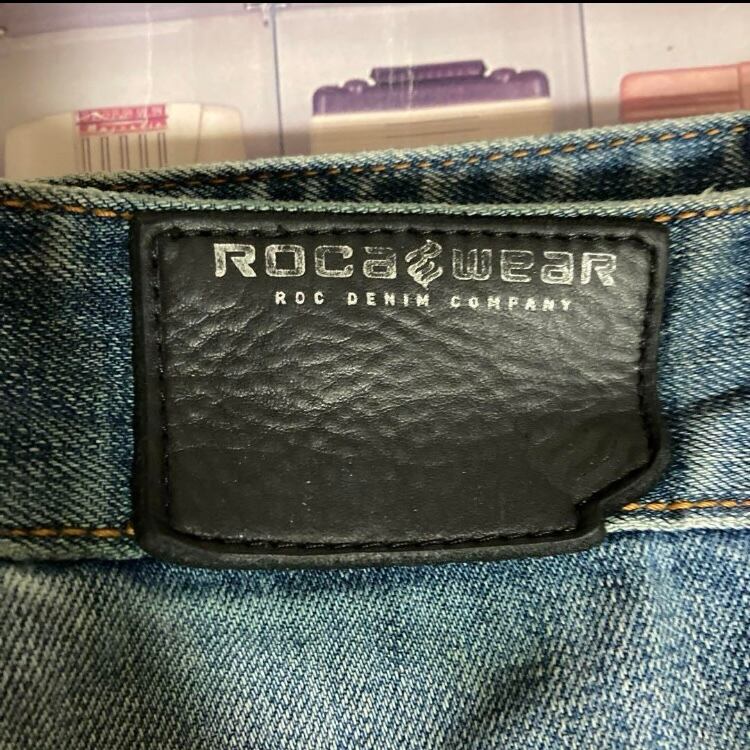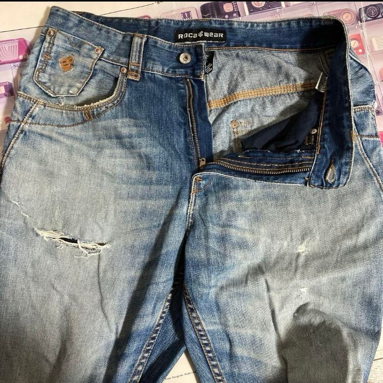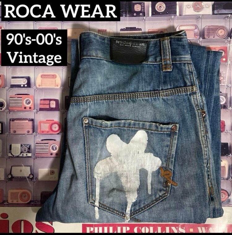 90s-00s ROCA WEAR USED加工ペイントバギーデニムパンツ革パッチ西海岸SK8チカーノHIPHOP B系