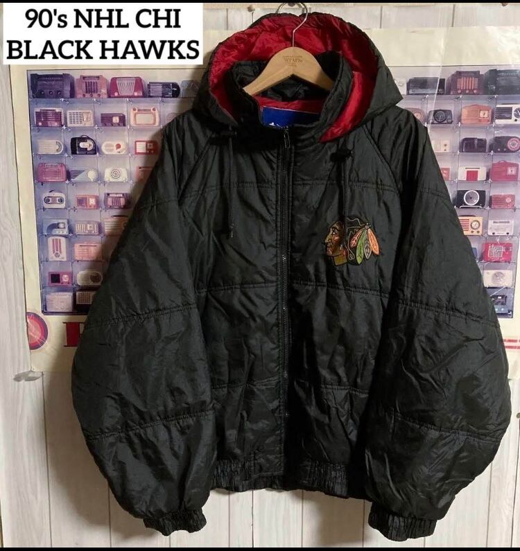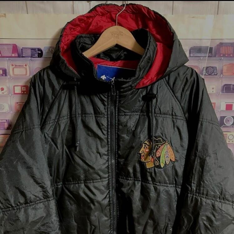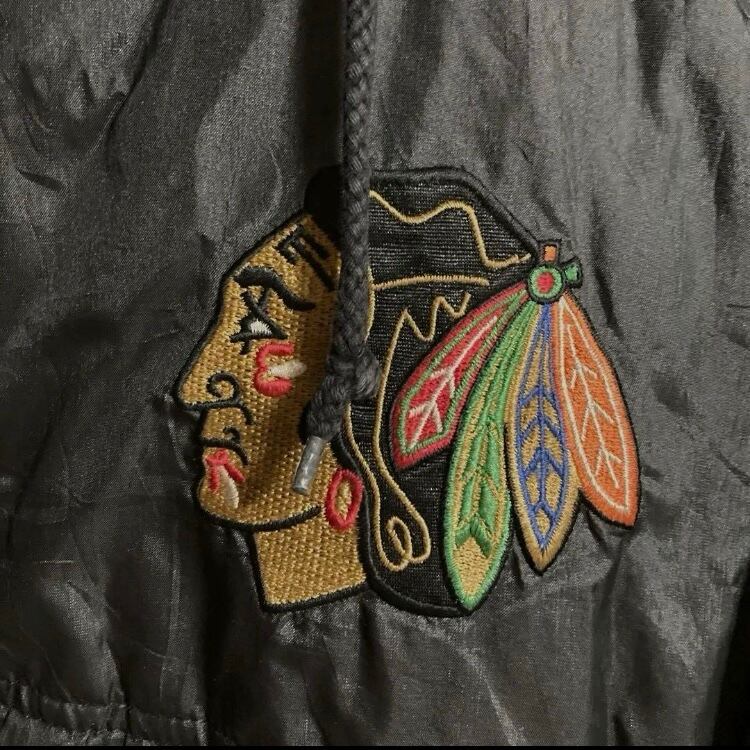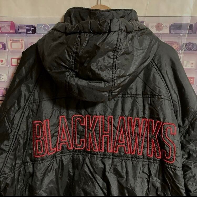 90s FANS GEAR NHLシカゴ・ブラックホークス CHICAGO BLACKHAWKS中綿ナイロンフードジャケット パーカーブルゾン ヴィンテージ